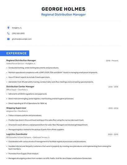 Build a professional regional distribution manager resume in minutes. Browse through our resume examples to identify the best way to word your resume. Then choose from 5+ resume templates to create your regional distribution manager resume.
