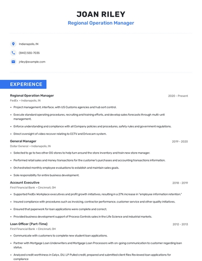 Build a professional regional operation manager resume in minutes. Browse through our resume examples to identify the best way to word your resume. Then choose from 5+ resume templates to create your regional operation manager resume.
