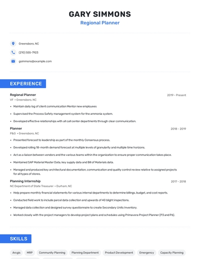 Build a professional regional planner resume in minutes. Browse through our resume examples to identify the best way to word your resume. Then choose from 5+ resume templates to create your regional planner resume.