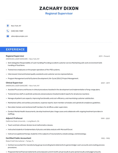 Build a professional regional supervisor resume in minutes. Browse through our resume examples to identify the best way to word your resume. Then choose from 5+ resume templates to create your regional supervisor resume.