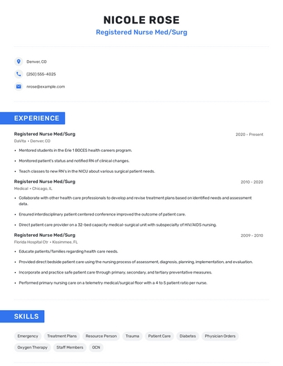 Build a professional registered nurse med/surg resume in minutes. Browse through our resume examples to identify the best way to word your resume. Then choose from 5+ resume templates to create your registered nurse med/surg resume.