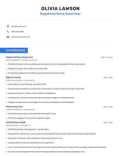 Build a professional registered nurse supervisor resume in minutes. Browse through our resume examples to identify the best way to word your resume. Then choose from 5+ resume templates to create your registered nurse supervisor resume.