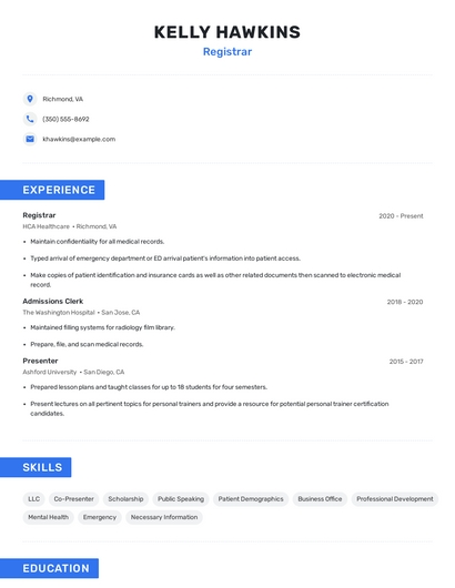 Build a professional registrar resume in minutes. Browse through our resume examples to identify the best way to word your resume. Then choose from 5+ resume templates to create your registrar resume.