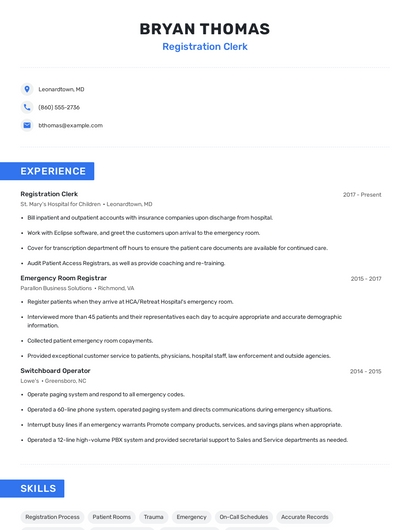 Build a professional registration clerk resume in minutes. Browse through our resume examples to identify the best way to word your resume. Then choose from 5+ resume templates to create your registration clerk resume.