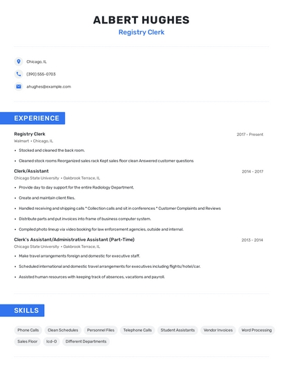 Build a professional registry clerk resume in minutes. Our AI resume writing assistant will guide you through every step of the process, and you can choose from 10+ resume templates to create your registry clerk resume.7. Computer System