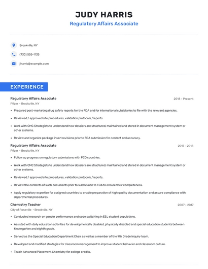 Build a professional regulatory affairs associate resume in minutes. Browse through our resume examples to identify the best way to word your resume. Then choose from 5+ resume templates to create your regulatory affairs associate resume.