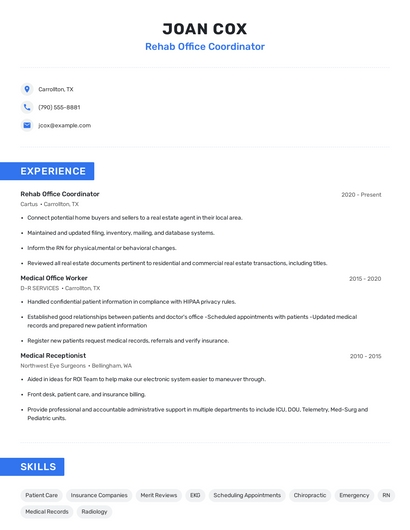 Build a professional rehab office coordinator resume in minutes. Our AI resume writing assistant will guide you through every step of the process, and you can choose from 10+ resume templates to create your rehab office coordinator resume.7. Due Dates