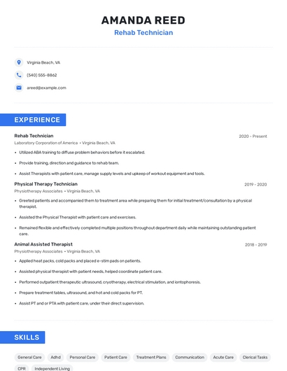 Build a professional rehab technician resume in minutes. Browse through our resume examples to identify the best way to word your resume. Then choose from 5+ resume templates to create your rehab technician resume.