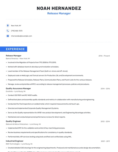 Build a professional release manager resume in minutes. Browse through our resume examples to identify the best way to word your resume. Then choose from 5+ resume templates to create your release manager resume.