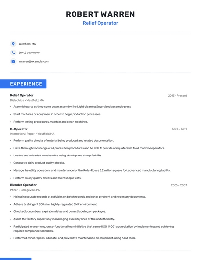 Build a professional relief operator resume in minutes. Browse through our resume examples to identify the best way to word your resume. Then choose from 5+ resume templates to create your relief operator resume.