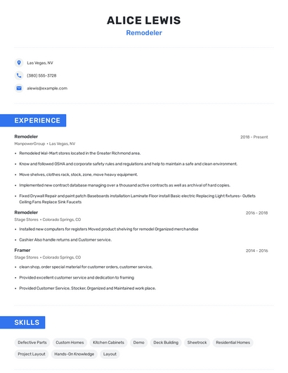 Build a professional remodeler resume in minutes. Browse through our resume examples to identify the best way to word your resume. Then choose from 5+ resume templates to create your remodeler resume.