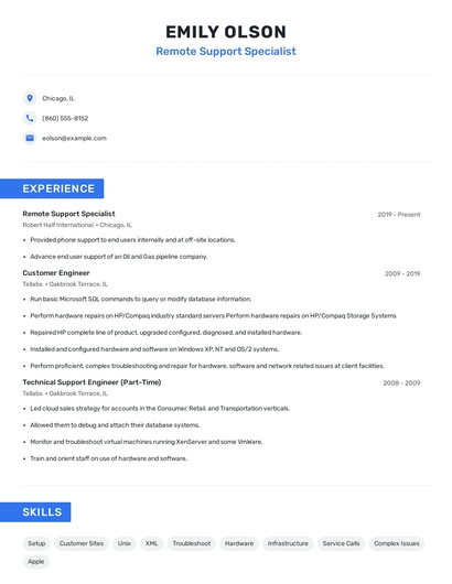 Build a professional remote support specialist resume in minutes. Browse through our resume examples to identify the best way to word your resume. Then choose from 5+ resume templates to create your remote support specialist resume.