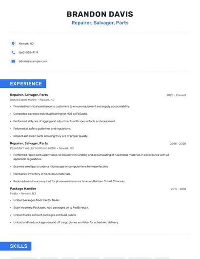The most important skills for a repairer, salvager, parts resume and required skills for a repairer, salvager, parts to have include: