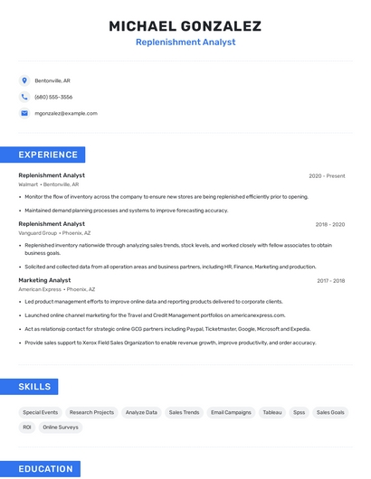 Build a professional replenishment analyst resume in minutes. Browse through our resume examples to identify the best way to word your resume. Then choose from 5+ resume templates to create your replenishment analyst resume.