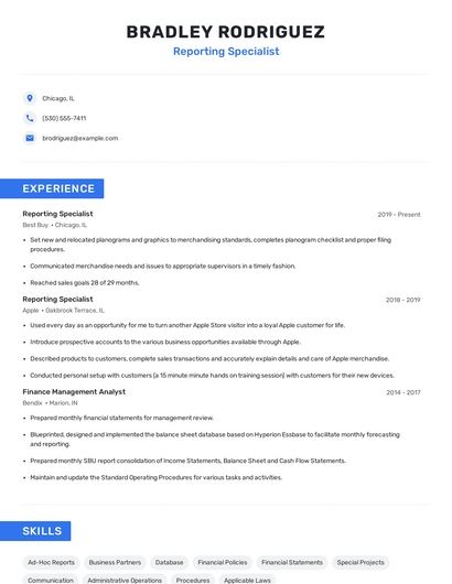 Build a professional reporting specialist resume in minutes. Browse through our resume examples to identify the best way to word your resume. Then choose from 5+ resume templates to create your reporting specialist resume.