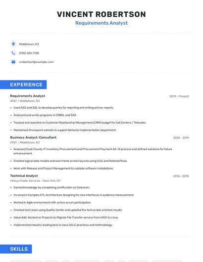 Build a professional requirements analyst resume in minutes. Browse through our resume examples to identify the best way to word your resume. Then choose from 5+ resume templates to create your requirements analyst resume.