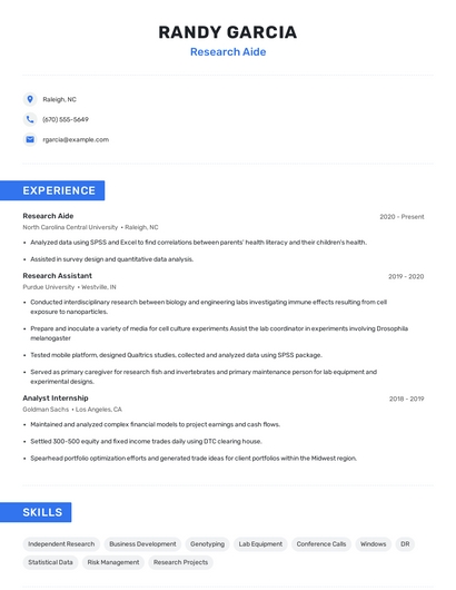 Build a professional research aide resume in minutes. Browse through our resume examples to identify the best way to word your resume. Then choose from 5+ resume templates to create your research aide resume.