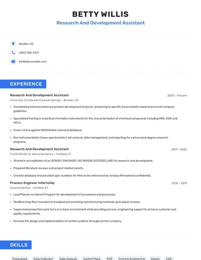 Build a professional research and development assistant resume in minutes. Browse through our resume examples to identify the best way to word your resume. Then choose from 5+ resume templates to create your research and development assistant resume.
