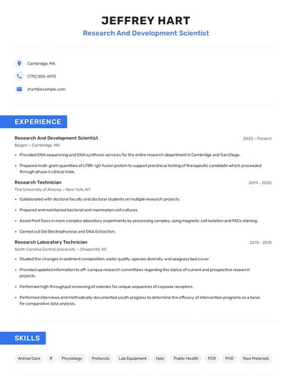 Build a professional research and development scientist resume in minutes. Browse through our resume examples to identify the best way to word your resume. Then choose from 5+ resume templates to create your research and development scientist resume.