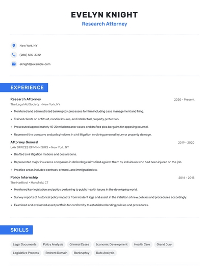 Build a professional research attorney resume in minutes. Browse through our resume examples to identify the best way to word your resume. Then choose from 5+ resume templates to create your research attorney resume.