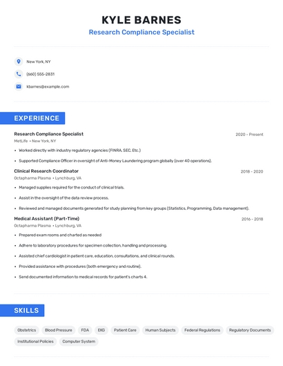 Build a professional research compliance specialist resume in minutes. Browse through our resume examples to identify the best way to word your resume. Then choose from 5+ resume templates to create your research compliance specialist resume.