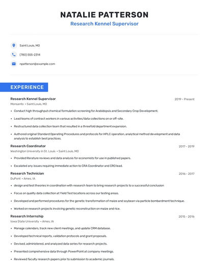 Build a professional research kennel supervisor resume in minutes. Browse through our resume examples to identify the best way to word your resume. Then choose from 5+ resume templates to create your research kennel supervisor resume.