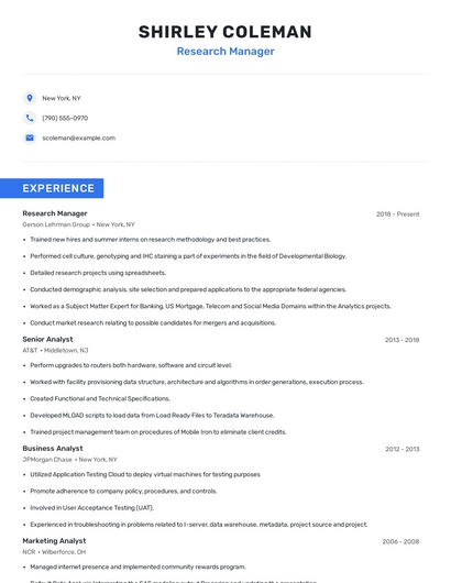 Build a professional research manager resume in minutes. Browse through our resume examples to identify the best way to word your resume. Then choose from 5+ resume templates to create your research manager resume.