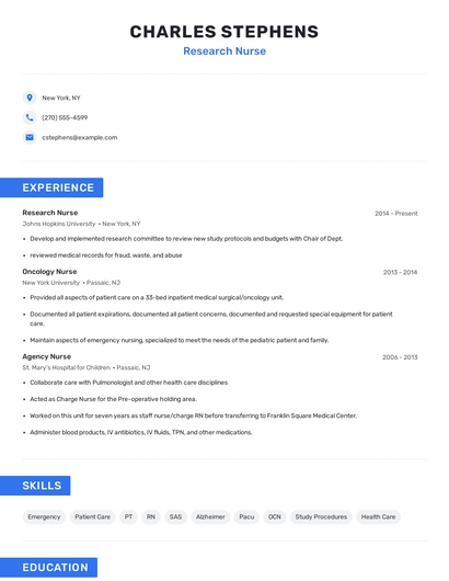 Build a professional research nurse resume in minutes. Browse through our resume examples to identify the best way to word your resume. Then choose from 5+ resume templates to create your research nurse resume.