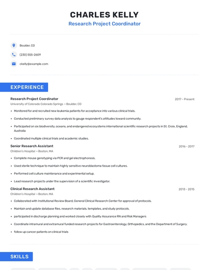 Build a professional research project coordinator resume in minutes. Browse through our resume examples to identify the best way to word your resume. Then choose from 5+ resume templates to create your research project coordinator resume.