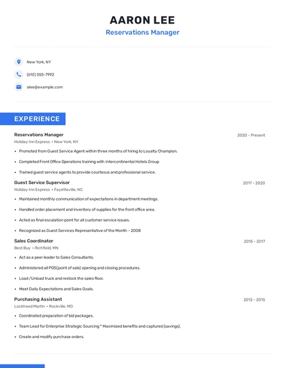 Build a professional reservations manager resume in minutes. Browse through our resume examples to identify the best way to word your resume. Then choose from 5+ resume templates to create your reservations manager resume.