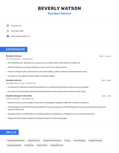 Build a professional resident advisor resume in minutes. Browse through our resume examples to identify the best way to word your resume. Then choose from 5+ resume templates to create your resident advisor resume.