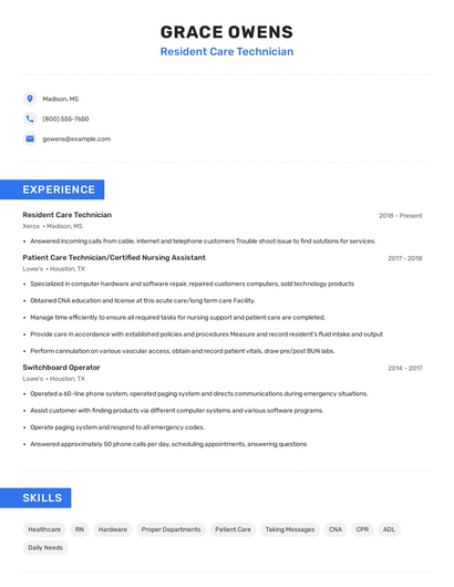 Build a professional resident care technician resume in minutes. Browse through our resume examples to identify the best way to word your resume. Then choose from 5+ resume templates to create your resident care technician resume.