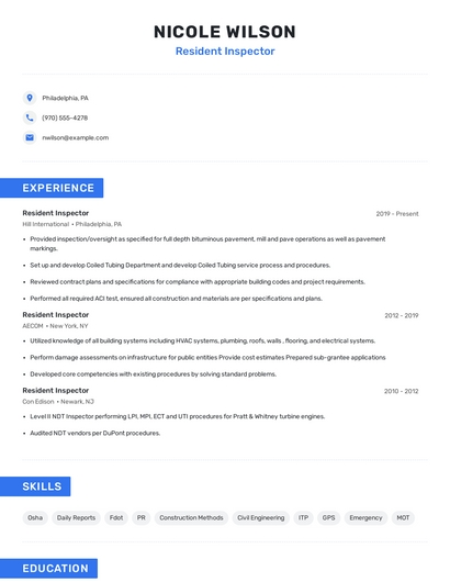 Build a professional resident inspector resume in minutes. Browse through our resume examples to identify the best way to word your resume. Then choose from 5+ resume templates to create your resident inspector resume.