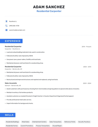 Build a professional residential carpenter resume in minutes. Browse through our resume examples to identify the best way to word your resume. Then choose from 5+ resume templates to create your residential carpenter resume.