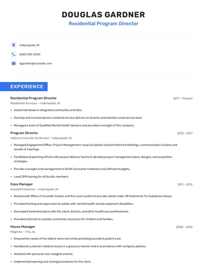 Build a professional residential program director resume in minutes. Browse through our resume examples to identify the best way to word your resume. Then choose from 5+ resume templates to create your residential program director resume.