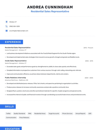 Build a professional residential sales representative resume in minutes. Browse through our resume examples to identify the best way to word your resume. Then choose from 5+ resume templates to create your residential sales representative resume.