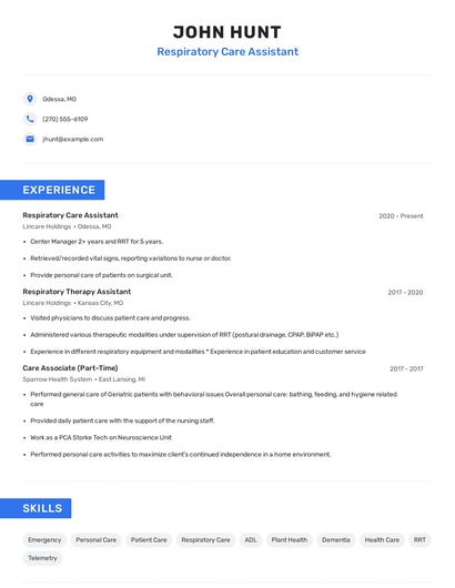 Build a professional respiratory care assistant resume in minutes. Browse through our resume examples to identify the best way to word your resume. Then choose from 5+ resume templates to create your respiratory care assistant resume.
