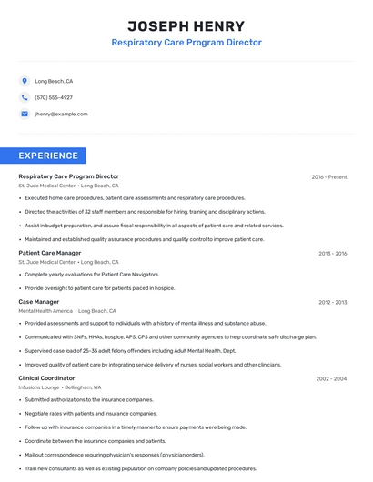 Build a professional respiratory care program director resume in minutes. Browse through our resume examples to identify the best way to word your resume. Then choose from 5+ resume templates to create your respiratory care program director resume.