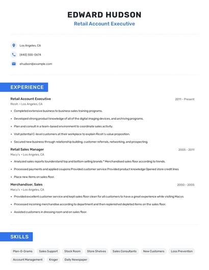 Build a professional retail account executive resume in minutes. Browse through our resume examples to identify the best way to word your resume. Then choose from 5+ resume templates to create your retail account executive resume.