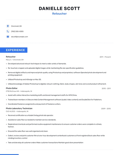 Build a professional retoucher resume in minutes. Browse through our resume examples to identify the best way to word your resume. Then choose from 5+ resume templates to create your retoucher resume.