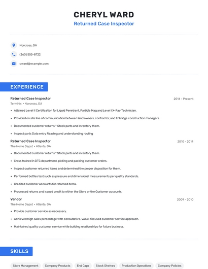The most important skills for a returned case inspector resume and required skills for a returned case inspector to have include: