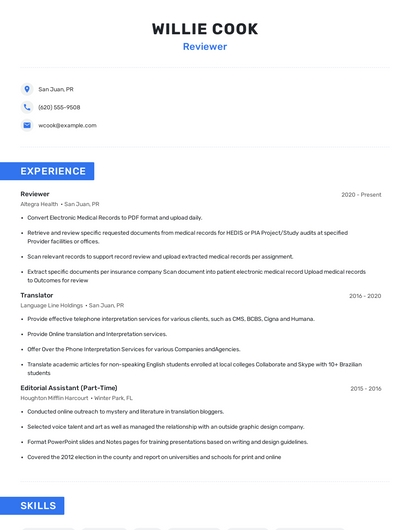 Build a professional reviewer resume in minutes. Browse through our resume examples to identify the best way to word your resume. Then choose from 5+ resume templates to create your reviewer resume.