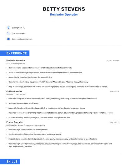 You can use Zippia's AI resume builder to make the resume writing process easier while also making sure that you include key information that hiring managers expect to see on a rewinder operator resume. You'll find resume tips and examples of skills, responsibilities, and summaries, all provided by Zippi, your career sidekick.