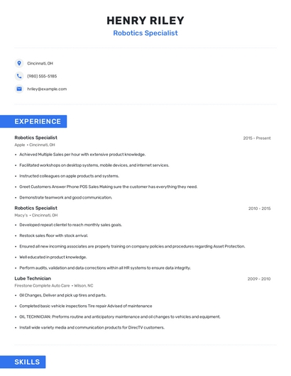 Build a professional robotics specialist resume in minutes. Our AI resume writing assistant will guide you through every step of the process, and you can choose from 10+ resume templates to create your robotics specialist resume.What skills help Robotics Specialists find jobs?