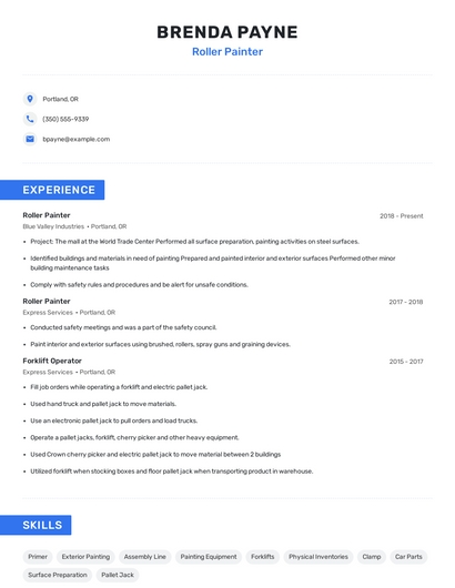 Build a professional roller painter resume in minutes. Our AI resume writing assistant will guide you through every step of the process, and you can choose from 10+ resume templates to create your roller painter resume.7. MIL