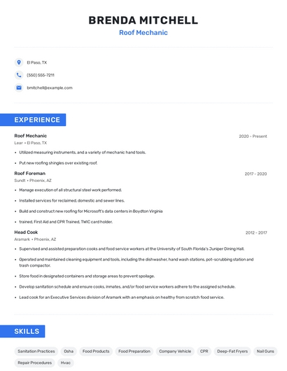 Build a professional roof mechanic resume in minutes. Browse through our resume examples to identify the best way to word your resume. Then choose from 5+ resume templates to create your roof mechanic resume.