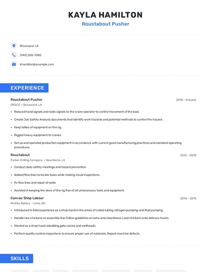 Build a professional roustabout pusher resume in minutes. Browse through our resume examples to identify the best way to word your resume. Then choose from 5+ resume templates to create your roustabout pusher resume.