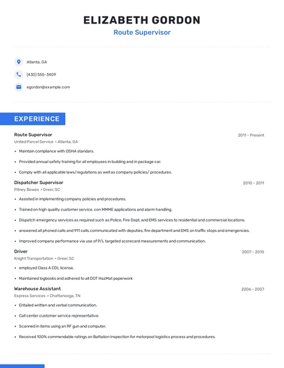 Build a professional route supervisor resume in minutes. Browse through our resume examples to identify the best way to word your resume. Then choose from 5+ resume templates to create your route supervisor resume.