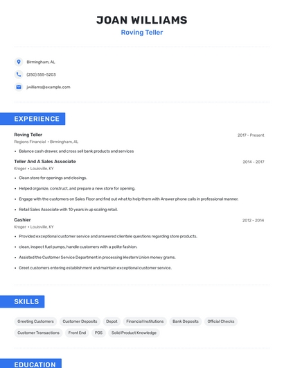Build a professional roving teller resume in minutes. Browse through our resume examples to identify the best way to word your resume. Then choose from 5+ resume templates to create your roving teller resume.