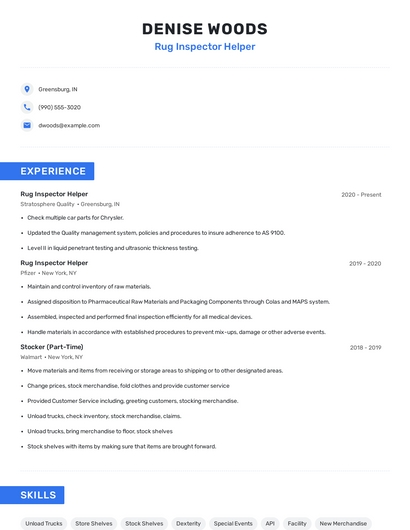 Build a professional rug inspector helper resume in minutes. Our AI resume writing assistant will guide you through every step of the process, and you can choose from 10+ resume templates to create your rug inspector helper resume.7. Assembly Line